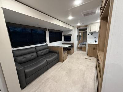 You'll love every minute spent in this spacious travel trailer! The front private bedroom includes a queen bed, dual closets, and an overhead shelf to keep your things organized. The U-shaped dinette and jack knife sofa within the large slide out in the living room can double as both seating space and sleeping space for guests. A full kitchen will let you make meals each day, and you'll appreciate the large pantry to keep snacks stocked. Head to the full rear bath to enjoy ample space to get ready, dual bath sinks, plus a linen closet with washer and dryer prep if you want to add these appliances.