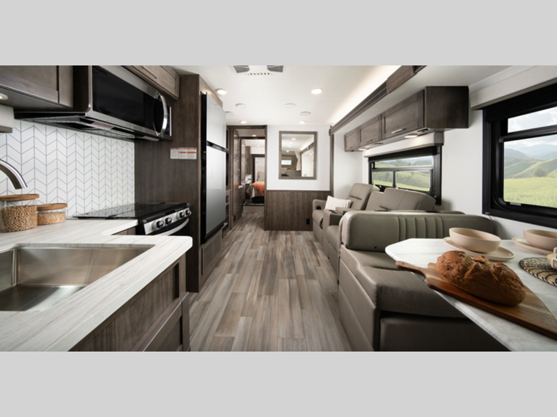 Sleeps 6 Slides 2 Length 32 ft 6 in Ext Width 8 ft 4 in Ext Height 11 ft 8 in Int Height 7 ft Interior Color Ashbrook, Farmhouse Exterior Color Standard Graphics, Partial Paint Hitch Weight 7500 lbs GVWR 14500 lbs Fresh Water Capacity 47 gals Grey Water Capacity 41 gals Black Water Capacity 32 gals Tire Size LT225/75R16 Furnace BTU 30000 btu Generator 4000W Fuel Type Gasoline Engine 7.3L V8 Horsepower 325 hp Fuel Capacity 55 gals Wheelbase 223 in Number Of Bunks 1 Available Beds Queen Torque 450 ft-lb Refrigerator Type 12V Refrigerator Size 10 cu ft Cooktop Burners 3 Shower Size 30" x 36" Number of Awnings 1 Axle Weight Front 5000 lbs Axle Weight Rear 9600 lbs LP Tank Capacity 12.2 gals Water Heater Capacity 6 gal Water Heater Type Gas/Electric DSI AC BTU 15000 btu TV Info LR LED HD Smart TV, Ext. LED HD Smart TV, CAB TV Awning Info 16' Electric with LED Lights Gross Combined Weight 22000 lbs Shower Type Standard Electrical Service 30 amp Similar Floorplans