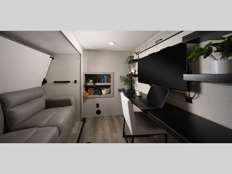 Each fifth wheel is built with Stronghold VBL™ aluminum framed and vacuum bond laminated gel coated fiberglass exterior walls including the rear wall and the slide room end walls. The Magnum Truss™ XL6 roof system is the strongest tested roof in the industry and the Climate Shield™ zero-degree tested weather protection comes with a fully-enclosed and heated underbelly to protect your unit's vitals. With the Jaycommand™ smart RV system, you can control the lighting and A/C without lifting a finger.