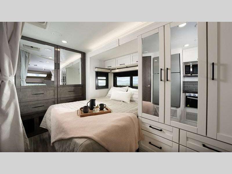 Each is built with a Stronghold VBL™ roof, floor, and sidewalls creating the lightest, yet strongest construction, and a one-piece, seamless fiberglass front cap that resists damage from moisture and debris. There are also aluminum running boards for easy entry into the cab and the main entrance which includes the industry's largest travel-view window and electric-powered step with an integrated house battery compartment. The interior offers seatbelts in all designed seating locations to protect your loved ones, hardwood cabinet doors and drawers for style and durability, high-intensity recessed LED ceiling lights and LED-lit slideout fascia, plus an interior command center and pleated blackout shades for privacy.