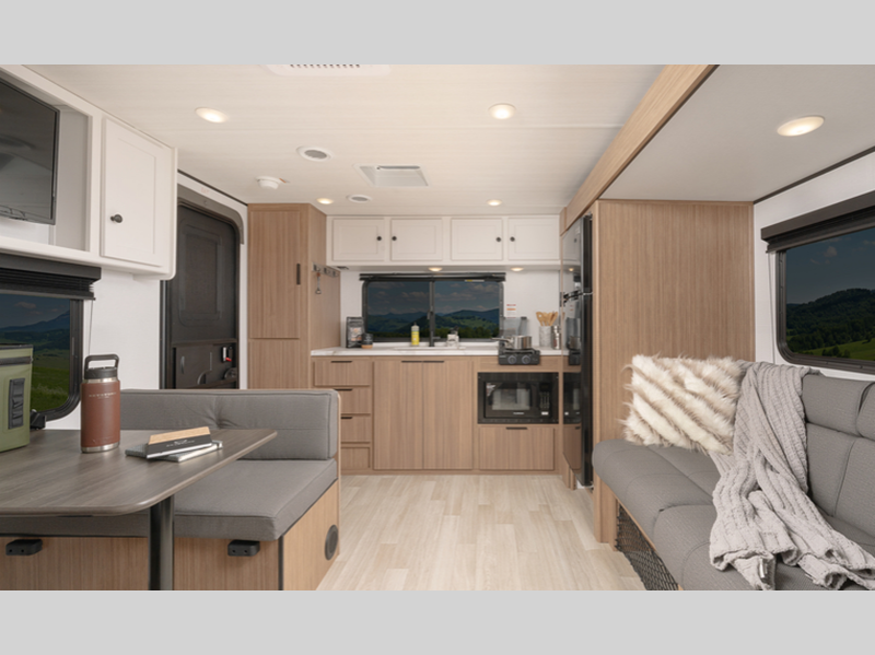 Sleeps 4 Length 21 ft 11 in Ext Height 10 ft 5 in Interior Color Cedar Frost Hitch Weight 400 lbs Dry Weight 3640 lbs Cargo Capacity 1160 lbs Fresh Water Capacity 37 gals Grey Water Capacity 30 gals Black Water Capacity 30 gals Tire Size ST235/75R15C Furnace BTU 20000 btu Available Beds Queen Refrigerator Type Large Double Door 12V Refrigerator Size 8 cu ft Cooktop Burners 2 Number of Awnings 1 LP Tank Capacity 20 lbs Water Heater Type Girard Tankless AC BTU 13500 btu Axle Count 1 Number of LP Tanks 1 Shower Type Standard Similar Floorplans