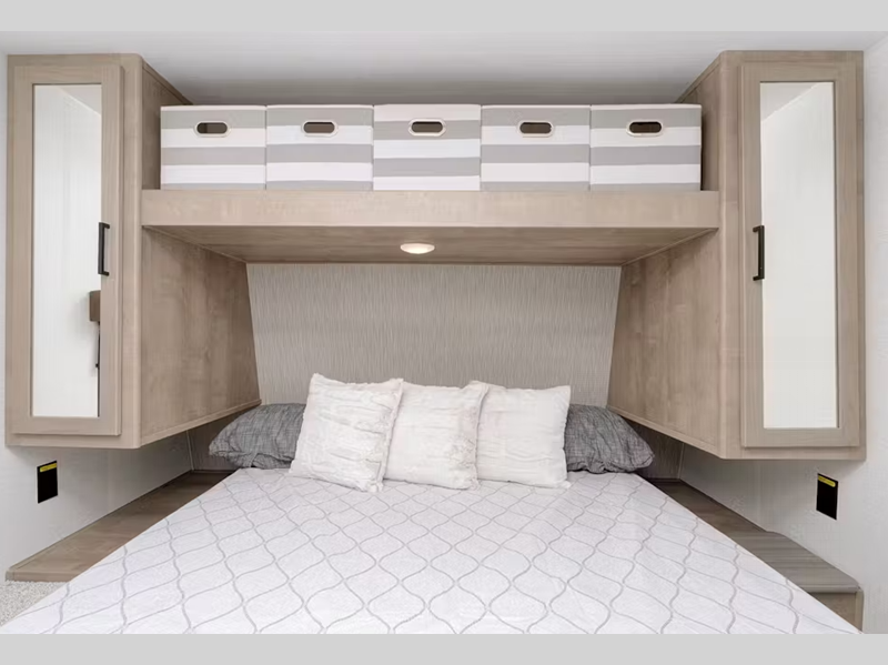 Each model features a power tongue jack, tinted safety glass windows, Solid Step entry steps, plus heavy-duty stabilizer jacks to name a few convenient exterior features. Inside, you'll enjoy pressed membrane premium countertops, blackout night shades, plenty of storage spaces, and many more comforts.