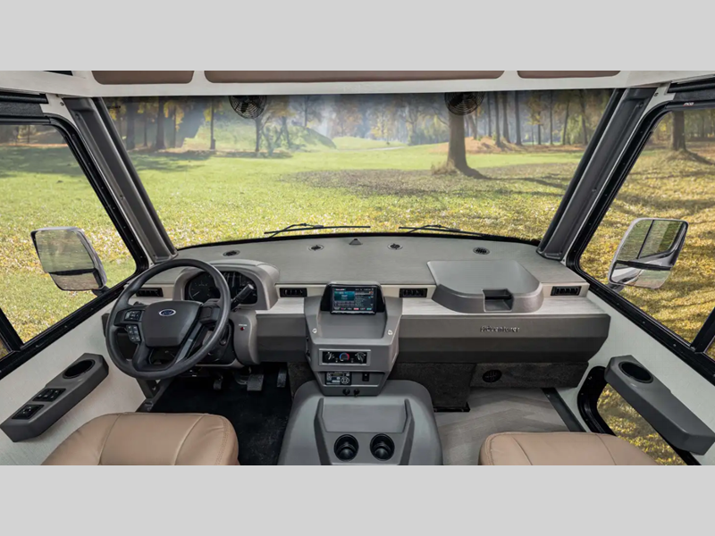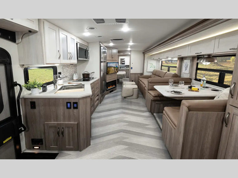 Sleeps 5 Slides 2 Length 35 ft 10 in Ext Width 8 ft 6 in Ext Height 12 ft 1 in Int Height 6 ft 10 in Interior Color Organic Comfort Dark, Organic Comfort Light, Bohemian Oasis Exterior Color Full-Body Paint; Silvermist, Wedgewood ll, Steel Grey, Night Sky Hitch Weight 5000 lbs GVWR 22000 lbs Fresh Water Capacity 74 gals Grey Water Capacity 51 gals Black Water Capacity 63 gals Tire Size 22.5" Furnace BTU 40000 btu Generator 5,500-Watt Cummins Onan Marquis Gold Fuel Type Gas Engine 7.3L V8 Chassis Ford F53 Fuel Capacity 80 gals Wheelbase 228 in Available Beds King Refrigerator Type Stainless Steel Residential with Ice Maker and Water Dispenser Convection Cooking Yes Cooktop Burners 3 Shower Size 36" x 36" Number of Awnings 1 Axle Weight Front 8000 lbs Axle Weight Rear 15000 lbs LP Tank Capacity 76.14 lbs Water Heater Capacity 10 gal Water Heater Type 110V/LP AC BTU 28500 btu Basement Storage 137 cu. ft. TV Info LR 39" HDTV, BR 32" HDTV, Ext. 32" HDTV Awning Info 16' Power w/LED Lighting Washer/Dryer Available Yes Gross Combined Weight 26000 lbs Shower Type Standard Electrical Service 50 amp Similar Floorplans