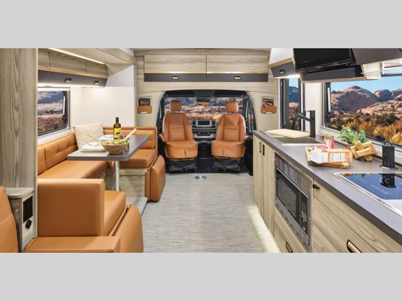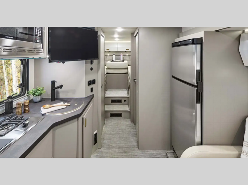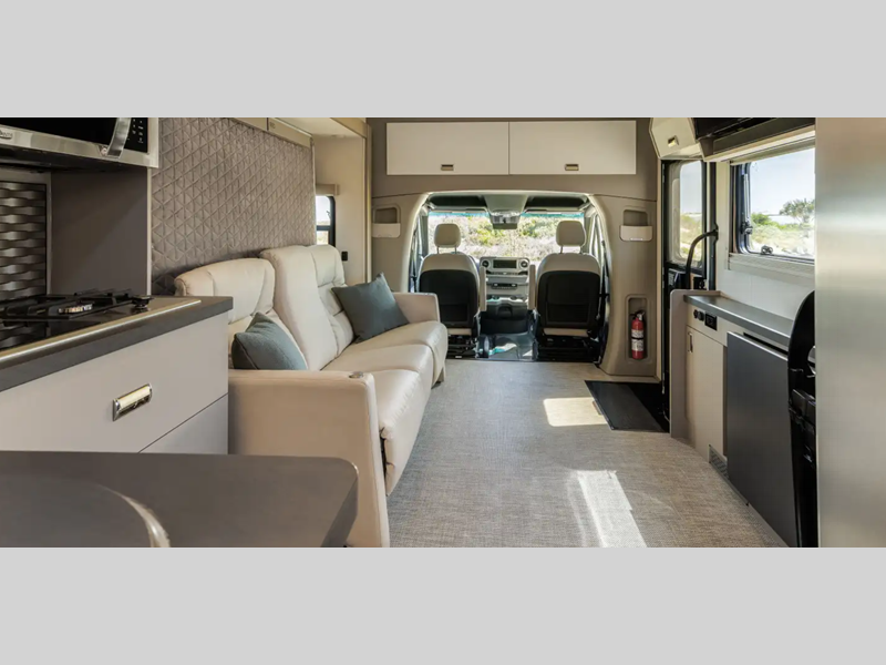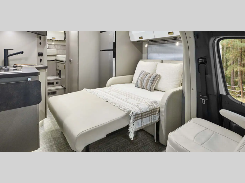 Sleeps 4 Slides 1 Length 25 ft 8 in Ext Width 7 ft 7 in Ext Height 10 ft 7 in Int Height 6 ft 8 in Interior Color Hygge Haus ll, Mod Allure ll Exterior Color Dune Frost Deluxe Graphics. Misty Lake, Precious Metals, Smokehouse Full-Body Paint Hitch Weight 5000 lbs GVWR 11030 lbs Fresh Water Capacity 30 gals Grey Water Capacity 46 gals Black Water Capacity 47 gals Furnace BTU 25000 btu Fuel Type Diesel Engine 2.0L High Output Turbo Diesel 4-Cylinder Chassis Mercedes-Benz RWD Sprinter Fuel Capacity 24.5 gals Wheelbase 170 in Number Of Bunks 1 Available Beds Twin Beds with King Conversion Refrigerator Type 12V Two Door Compressor Driven Refrigerator Size 10 cu ft Convection Cooking Yes Cooktop Burners 2 Shower Size 25" x 30" Number of Awnings 1 Axle Weight Front 4410 lbs Axle Weight Rear 7720 lbs LP Tank Capacity 50.76 Water Heater Type Truma AquaGo Comfort Plus Tankless AC BTU 15000 btu Basement Storage 80.9 cu. ft. TV Info 32" LED HDTV Awning Info 16' Power with LED Lights & Bluetooth Control Gross Combined Weight 15250 lbs Shower Type Standard Electrical Service 30 amp Similar Floorplans