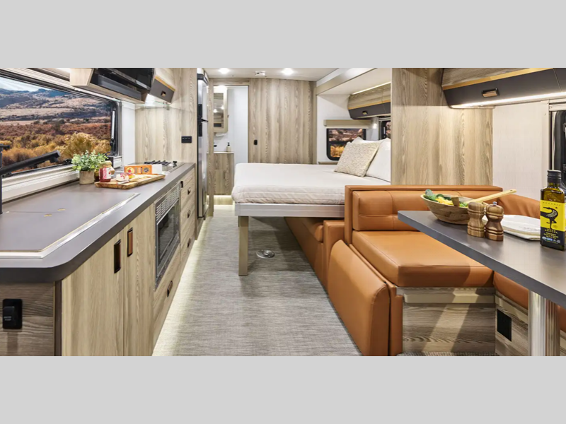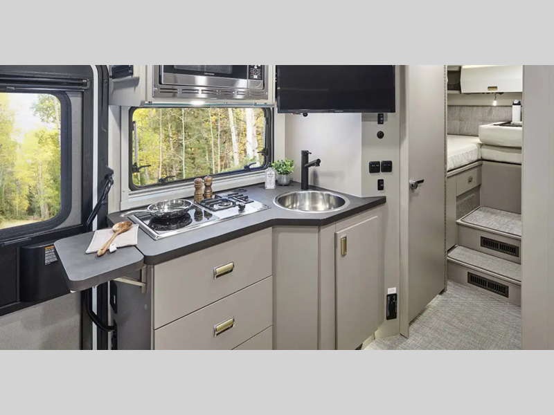 Sleeps 3 Slides 1 Length 25 ft 8 in Ext Width 7 ft 7 in Ext Height 10 ft 7 in Int Height 6 ft 8 in Interior Color Hygge Haus ll, Mod Allure ll Exterior Color Dune Frost, Misty Lake, Precious Metals, Smokehouse Hitch Weight 5000 lbs GVWR 11030 lbs Fresh Water Capacity 30 gals Grey Water Capacity 46 gals Black Water Capacity 47 gals Furnace BTU 25000 btu Fuel Type Diesel Engine 2.0L High Output Turbo Diesel 4-Cylinder Chassis Mercedes-Benz RWD Sprinter Fuel Capacity 24.5 gals Wheelbase 170 in Number Of Bunks 1 Available Beds Murphy Refrigerator Type 12V Two Door Compressor Driven Refrigerator Size 10 cu ft Convection Cooking Yes Cooktop Burners 2 Shower Size 30" x 34" Number of Awnings 1 Axle Weight Front 4410 lbs Axle Weight Rear 7720 lbs LP Tank Capacity 50.76 Water Heater Type Truma AquaGo Comfort Plus Tankless AC BTU 15000 btu Basement Storage 80.9 cu. ft. TV Info 32" LED HDTV Awning Info 16' Power with LED Lights & Bluetooth Control Gross Combined Weight 15250 lbs Shower Type Shower w/Seat Electrical Service 30 amp Similar Floorplans