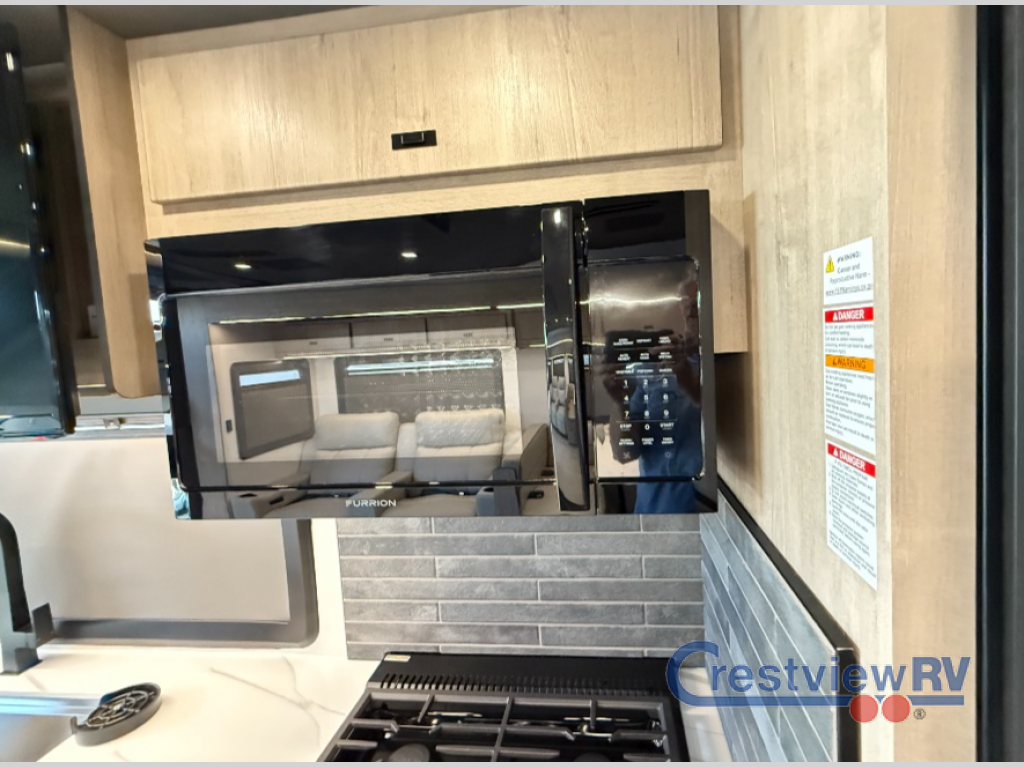 You can be sure to enjoy the journey and the stay in this coach! Once you stop for the day, you can make lunch with the kitchen appliances, then dine at the booth dinette within the large slide out. There is also power theater seating here across from a TV for easy viewing. A 10 cu. ft. 12V refrigerator and pantry will let you keep food stocked, and the closet with washer and dryer prep gives you the option to add these appliances. The 70" x 80" king bed slide is sure to provide a great night's rest, and there is a wardrobe to keep your things tidy. And of course, a full rear corner bath onboard makes staying fresh easier than ever!